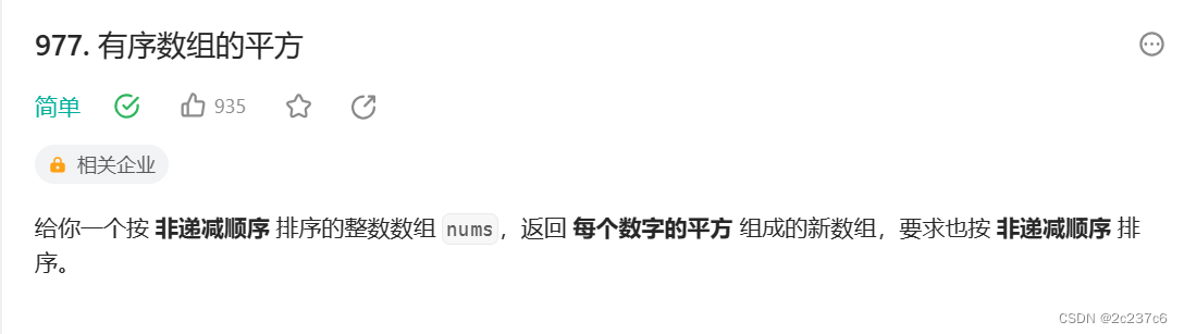 根据题目要求我们要求解一个有序数组的平方数组,看起来是很简单但是大家不要忘记了题目要求 非递减顺序 换句话来说就是递增排序,如果全是正数还好直接返回所以数的平方就可以,但是我们题目中的样例考虑的十分周全,有负数,而这个负数很大概率是我们出错的原因,为什么?因为负数越小其绝对值越大,假设我们最新的负数为-31524154,而我们最大正数为8,你想下是8的平方更大还是上面的负数的平方更大,结果显然而知,所以直接返回每一位的平方可以回出现不是从小到大排序的情况。所以我们要对我们平方后的数组进行排序,这个就是一刷的解题思路。