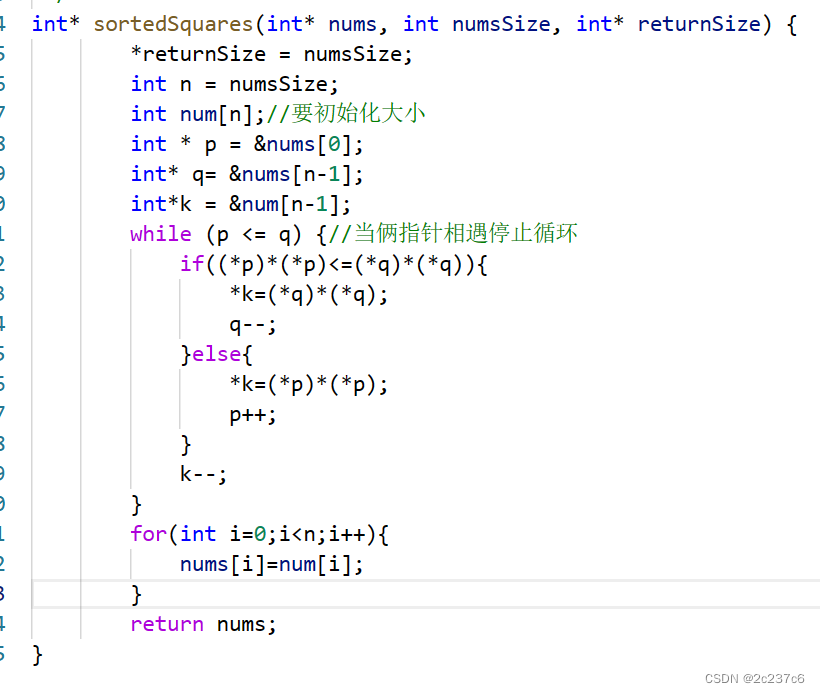 我们定义俩个指针一个指向我们得到的数组的首地址,然后一个指向我们数组的尾地址,然后我们在定义一个数组去存储我们新的数组,然后我们该进行什么操作呢?我们将头指针和尾指针指向的元素进行比较,当我们的头指针元素的平方小于尾指针元素的平方我们就将哪个最大的尾元素存储在我们另一个数组尾指针指向的哪个空间,如果头指针元素的平方大于等于尾指针元素的平方我们就将哪个最大的尾元素存储在我们另一个数组尾指针指向的哪个空间,直到我们前后指针彼此相遇就代表这上面的遍历完成然后因为我们是不断将最大值先存储然后最小值,这个是为什么?为什么全是前后比较然后中,因为上都说了是要有序数组我们最大或者最小都在端点,负数为什么回成为最大我就不说了要平方大家不懂可以向上面看可以得到答案。最后我们新建数组就有是有序的直接返回就可以。