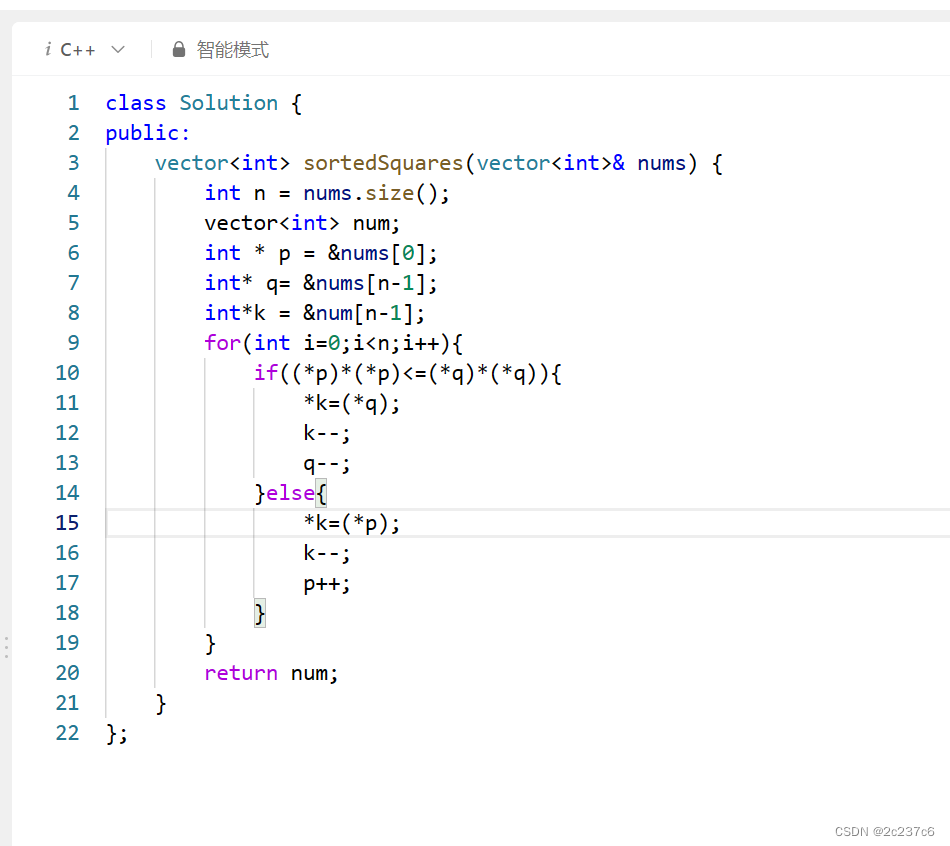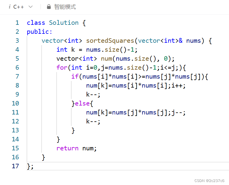 相较于一刷二刷明显更加轻车熟路了,我们发现我们上面用了另一个vector容器去存储我们平方的元素,但是我们发现这个样子很不节省空间,空间复杂度因为一个数组而直接上涨,所以二刷直接对此进行改进,我们就没有去定义数组而是在原来容器的基础上,对其进行平方,然后在对其进行排序,最后得到正确结果。