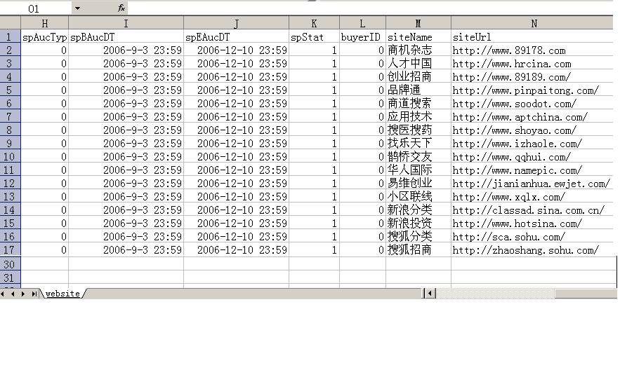 包含的列:spID,spName,spIniPrice,spIncExtent,spNowPrice,spImage,spBidNum,spAucType,spBAucDT,spEAucDT,spStat,buyerID,siteName,siteUrl