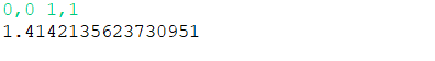import java.util.Scanner; public class Main { public static void main(String[] args) { Scanner input=new Scanner(System.in); int i,a=0,b=0,a1=0,a2=0,b1=0,b2=0,t=0; double x1,x2,y1,y2; String point1 = new String(); String point2 = new String(); String line=input.nextLine(); for(i=0;i<line.length();i++) { if(line.charAt(i)==' ') { point1 = line.substring(0, i); point2 = line.substring(i+1, line.length()); break; } } for(i=0;i<point2.length();i++) { if(point2.charAt(i)==' ') { t=1; break; } } point1=point1.replace(","," "); point2=point2.replace(","," "); String[] poi1=point1.split(" "); String[] poi2=point2.split(" "); x1=Double.parseDouble(poi1[0]); y1=Double.parseDouble(poi1[1]); x2=Double.parseDouble(poi2[0]); y2=Double.parseDouble(poi2[1]); if(t==1) { System.out.print("wrong number of points"); } else { System.out.print(Math.sqrt((x1-x2)*(x1-x2)+(y1-y2)*(y1-y2))); } } }