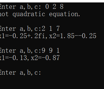 #include<math.h> #include<stdio.h> int main(){ float a,b,c,x1,x2; float delta,real,imag; printf("Enter a,b,c: "); while(scanf("%f%f%f",&a,&b,&c)!=EOF) { if(a==0) printf("not quadratic equation.\n\n"); else{ delta=b*b-4*a*c; if(delta>=0){ x1=(-b+sqrt(delta))/(2*a); x2=(-b-sqrt(delta))/(2*a); printf("x1=%.2f,x2=%.2f\n\n",x1,x2); } else{ real=-b/(2*a); imag=sqrt(-delta)/(2*a); printf("x1=%.2f+.2fi,x2=%.2f-%.2f\n\n",real,imag,real,imag); } } printf("Enter a,b,c:"); } return 0; }