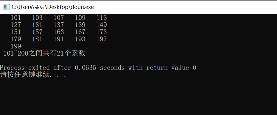 #include<stdio.h> #include<stdlib.h> #include<math.h> int main() { int k,m,i,n=0; for(k=101;k<=200;k++){ m=sqrt(k); for(i=2;i<=m;i++) if(k%i==0)break; if(i>m){ printf("%6d",k); n++; if(n%5==0) printf("\n"); } } printf("\n 101~200之间共有%d个素数",n); return 0; }