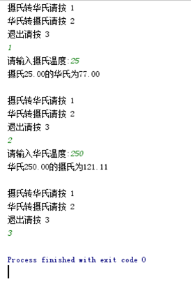 while True: a = int(input('摄氏转华氏请按 1\n华氏转摄氏请按 2\n退出请按 3\n')) if a==1: c = float(input('请输入摄氏温度:')) f =c*9/5+32 print('摄氏{:.2f}的华氏为{:.2f}\n'.format(c,f)) elif a==2: f = float(input('请输入华氏温度:')) c = 5/9*(f-32) print('华氏{:.2f}的摄氏为{:.2f}\n'.format(f,c)) else: break