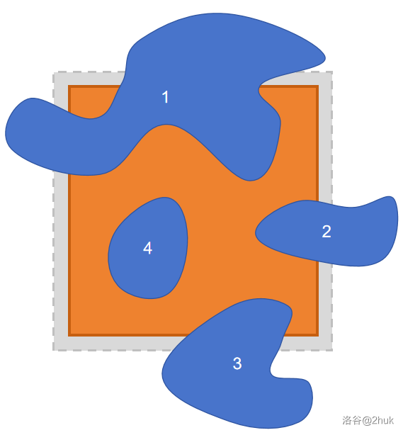 对于 \(1, 2, 3\) 的统计是容易。这些连通块与外部接触,我们只需要枚举这个矩阵的外面一圈,也就是灰色一圈。也就是说这种连通块有 \(\mathcal O(k)\) 个。