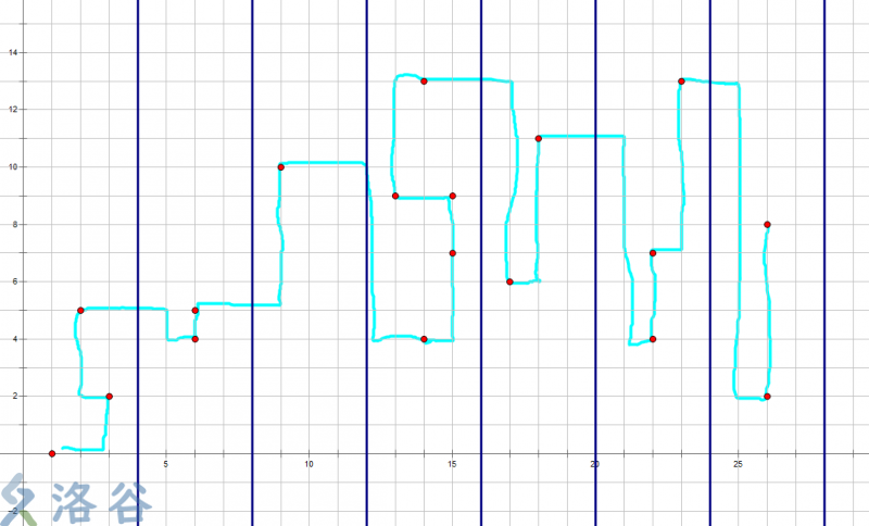 我们知道每个组内一定只向上走,而一个组内最低和最高点的纵坐标之差是 \(\mathcal O(n)\) 的,于是向上走的步数为 \(\mathcal O(\dfrac qB\times n)\)。