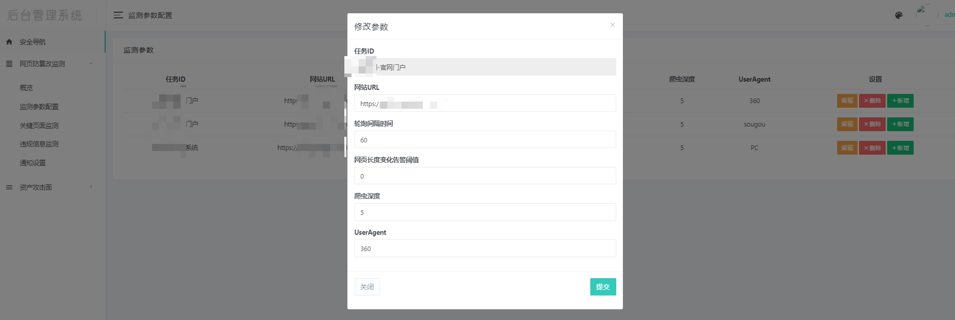 配置相关参数,可以增删改查,参数保存在数据库中让任务执行是读取,防篡改关键字直接保存在数据库中,暂不支持在前端调整