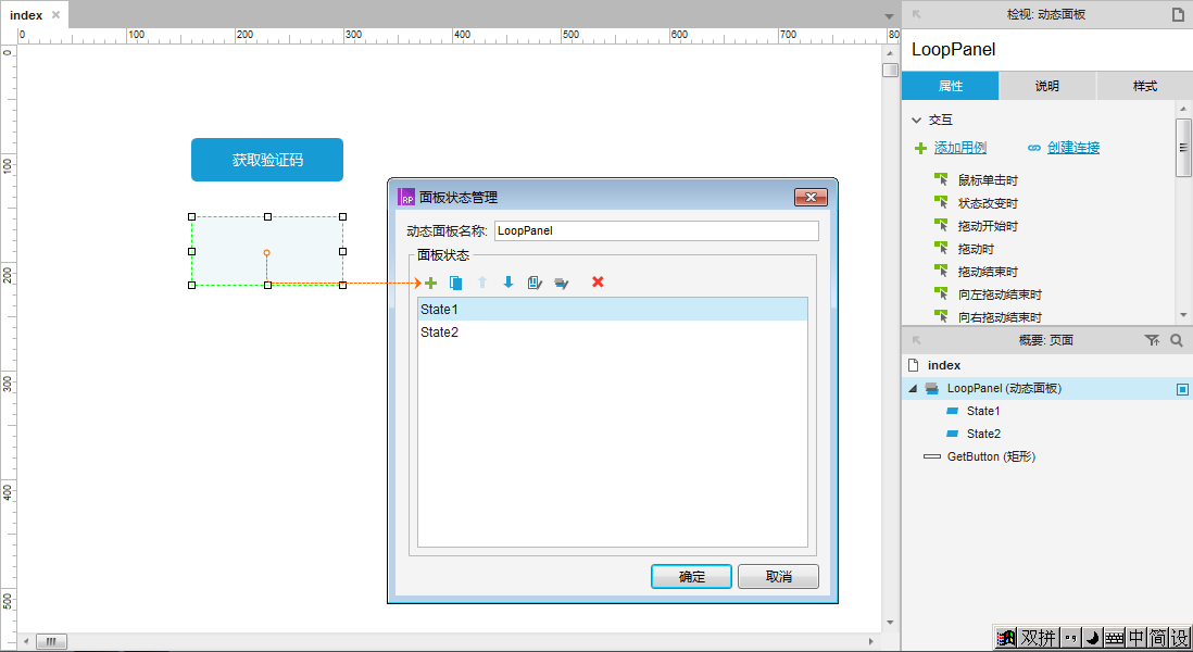 2、要有一个获取验证码的按钮,和一个可以实现循环功能的元件-动态面板。动态面板可以通过切换状态实现循环,就必须有2个(含)以上的状态。【步骤2】