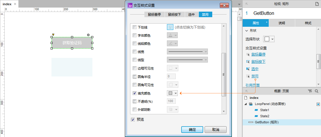 3、为按钮“GetButton”设置【禁用】状态的交互样式,【填充颜色】为灰色。