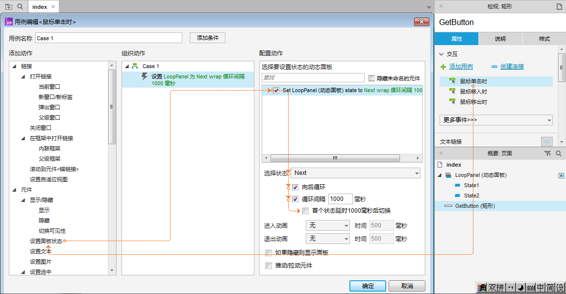 4、为按钮“GetButton”添加【鼠标单击时】的用例,设置动作为【设置面板状态】于动态面板“LoopPanel”,选择状态【Next】,勾选【向后循环】,设置自动循环间隔为【1000】毫秒,取消【首个状态延时1000毫秒切换】的选项。