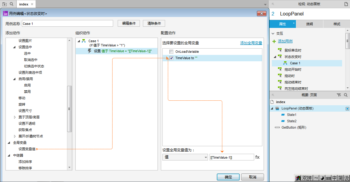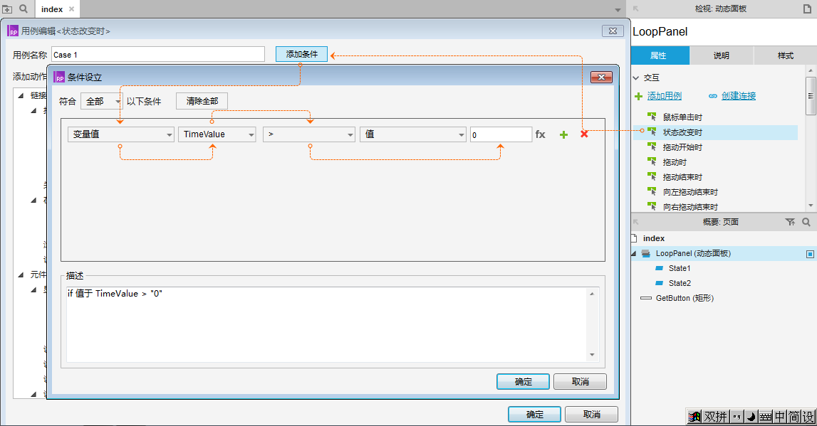 6、为动态面板“LoopPanel”的【状态改变时】添加第一个用例并设置条件,条件设置为【变量值】【TimeValue】【>】【值】“1”。