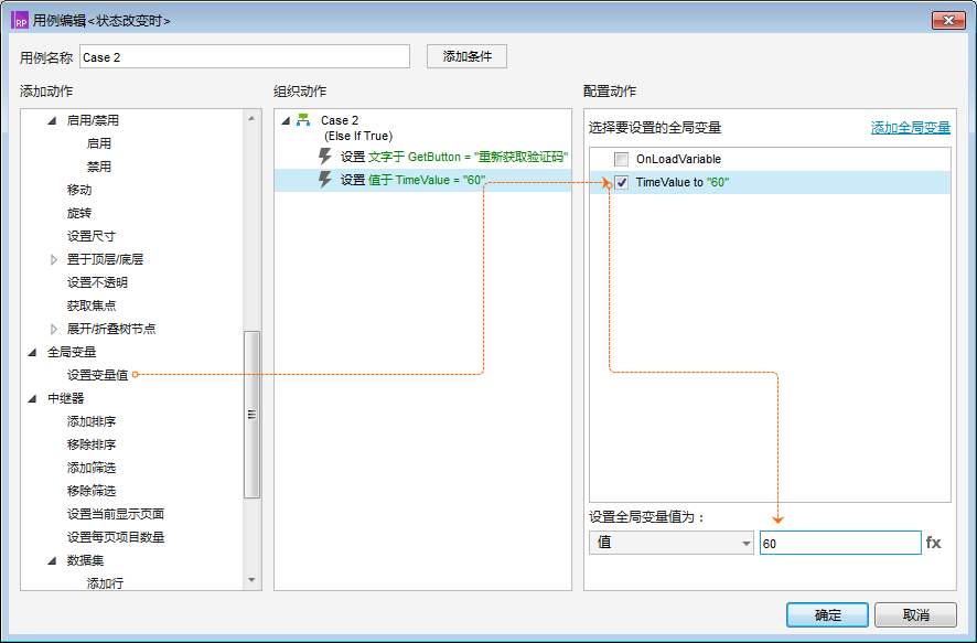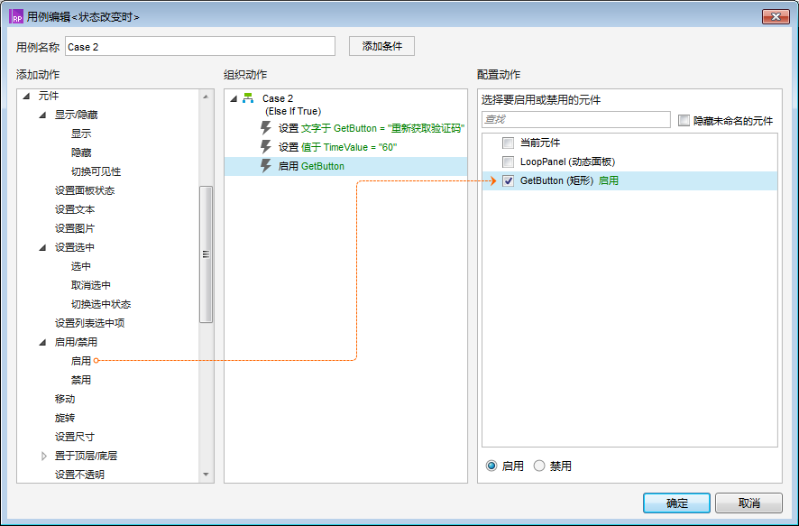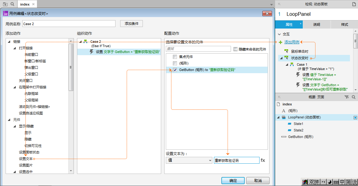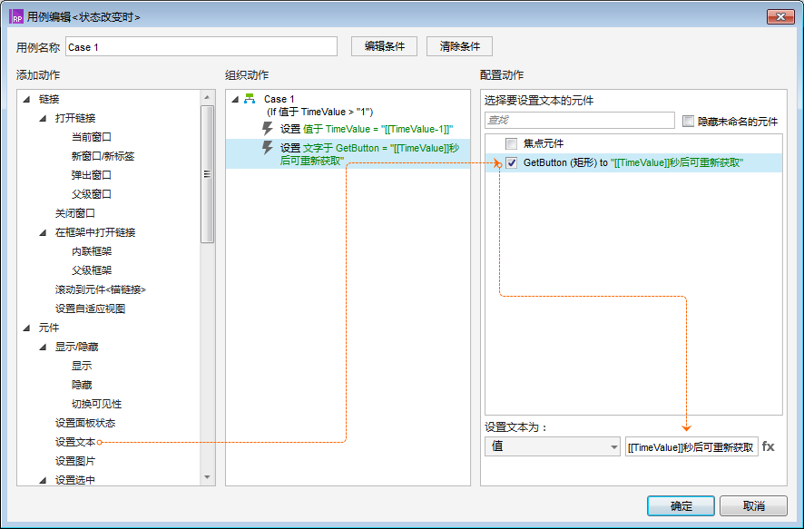 9、为【状态改变时】再次添加用例,设置不满足第1个用例的条件时执行的动作。第1个动作为【设置文本】于“GetButton”为【值】“重新获取验证码”。