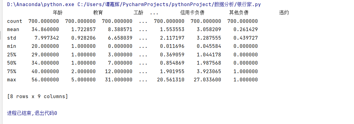 #从bankloan.xls中读取数据 data_load = "work/bankloan.xls" data = pd.read_excel(data_load) print(data.describe())