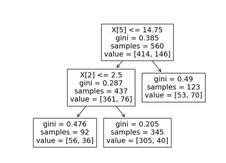 X = np.array(data.iloc[:, 0:-1]) y = np.array(data.iloc[:, -1]) X_train, X_test, y_train, y_test = train_test_split(X, y, random_state=1, train_size=0.8, test_size=0.2, shuffle=True) Dtree = DecisionTreeClassifier(max_leaf_nodes=3, random_state=13) Dtree.fit(X_train, y_train) y_pred = Dtree.predict(X_test) accuracy_score(y_test, y_pred) tree.plot_tree(Dtree) plt.show()