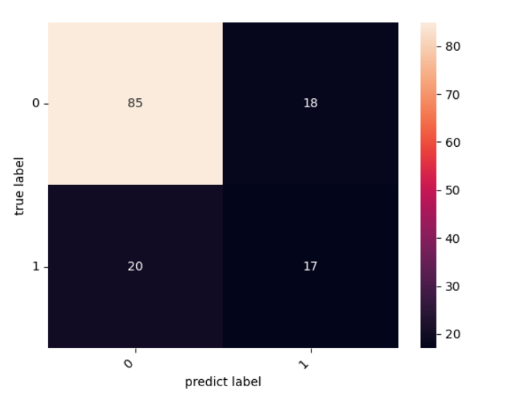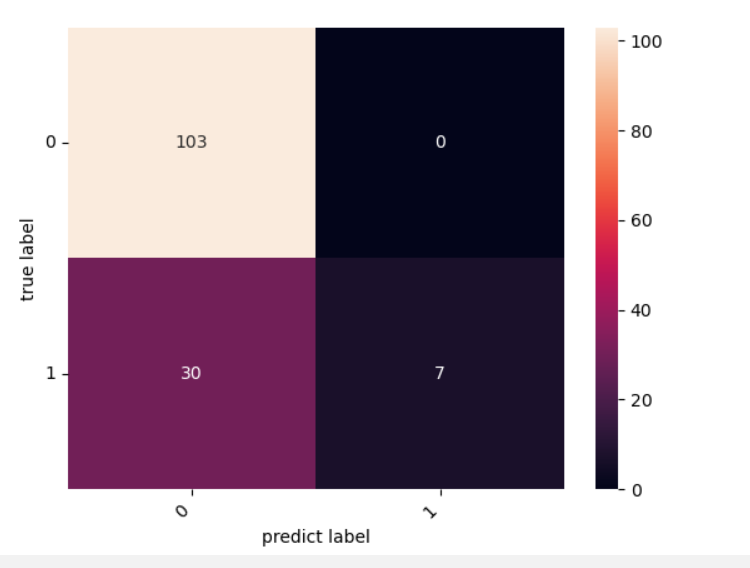 cm = confusion_matrix(y_test, y_pred) heatmap = sns.heatmap(cm, annot=True, fmt='d') heatmap.yaxis.set_ticklabels(heatmap.yaxis.get_ticklabels(), rotation=0, ha='right') heatmap.xaxis.set_ticklabels(heatmap.xaxis.get_ticklabels(), rotation=45, ha='right') plt.ylabel("true label") plt.xlabel("predict label") plt.show()