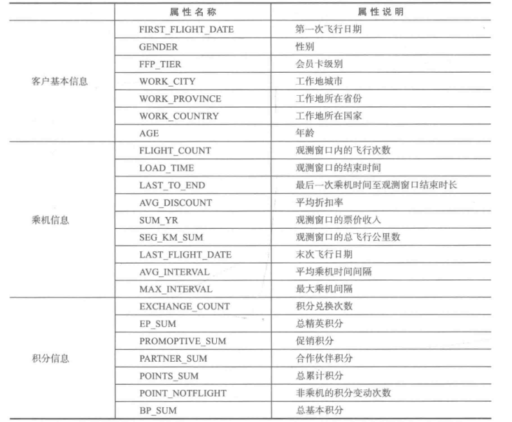我们的数据集,主要包含客户基本信息,乘机信息,积分信息3类信息,一共44个字段。其中比较重要的如下: