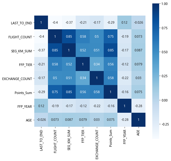 可以看到年龄和入会月份和其他的乘机信息似乎并没有很强的相关性,可以考虑舍弃这部分信息。而飞行总里程,飞行次数,累积积分间果然有比较强的相关性,因此,舍弃其中的部分特征或是用一些特征来代替和补充一些信息。