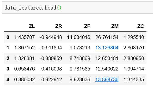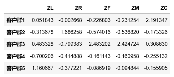 当前的数据结构为标准化后的客户关系长度L、消费时间间隔R、消费频率F、飞行里程M、折扣系数的平均值C,数据结构如下: