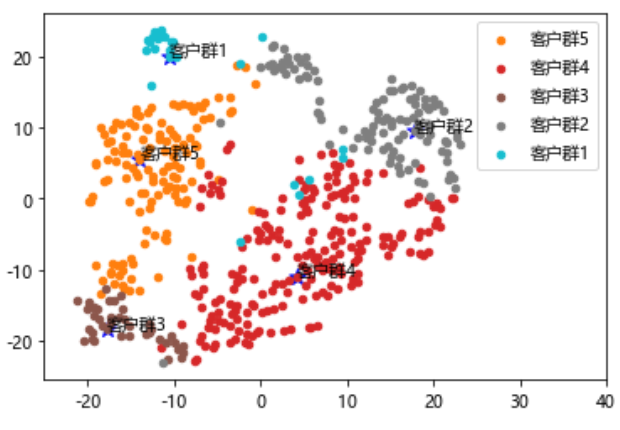 import numpy as np np.random.seed(19680801) import matplotlib.pyplot as plt fig, ax = plt.subplots() for label in labels.unique(): ax.scatter(Y[:,0][labels.index == "客户群" + str(label+1)],Y[:,1][labels.index == "客户群" + str(label +1)],s=100,marker = "*",edgecolors = "b") ax.text(Y[:,0][labels.index == "客户群" + str(label+1)],Y[:,1][labels.index == "客户群" + str(label +1)],f"客户群{label+1}") ax.scatter(Y[:,0][labels == label], Y[:,1][labels == label], s=20, label="客户群" + str(label+ 1),) ax.legend() ax.set_xlim([-25,40]) plt.show()