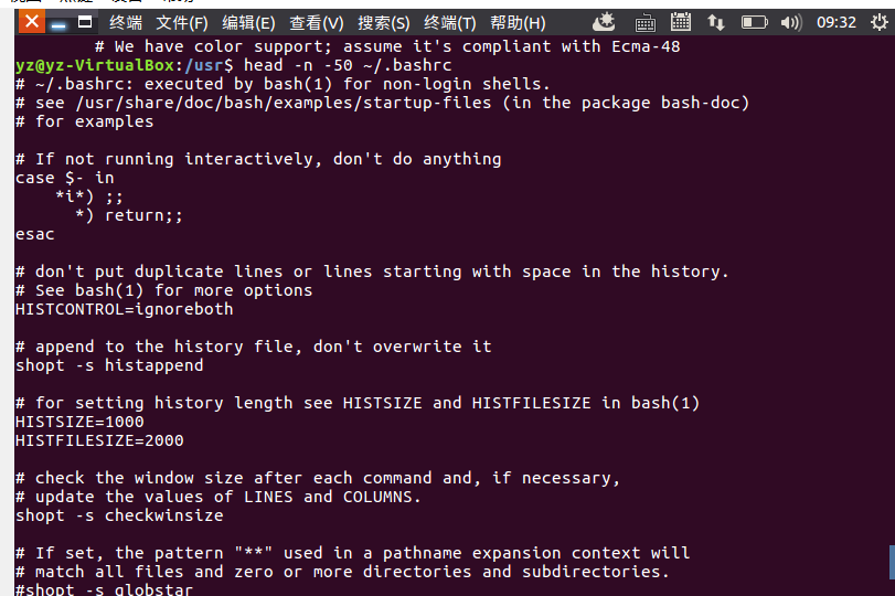 (19)查看主文件夹下.bashrc文件内容,后面50行不显示,只显示前面几行