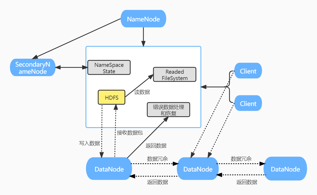 2.用图与自己的话,简要描述名称节点、第二名称节点、数据节点的主要功能及相互关系。
