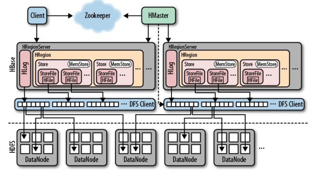 HRegion部分由很多的HRegion组成,存储的是实际的数据。每一个HRegion又由很多的Store组成,每一个Store存储的实际上是一个列簇(ColumnFamily)下的数据。