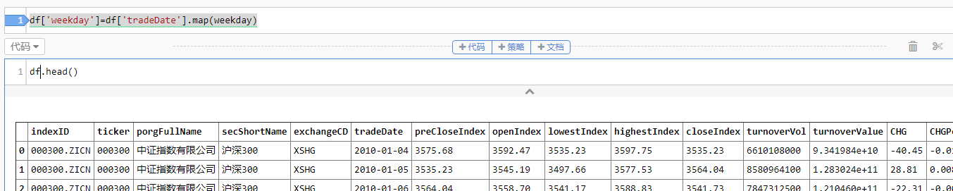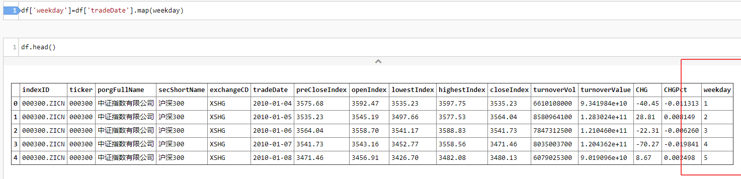 然后我们把这个函数应用到全部的行,通过传入每一行的tradeDate 交易日字段,计算出改行的星期X 中的X。