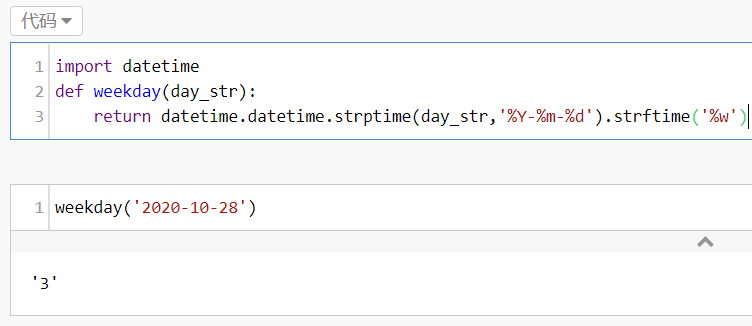 import datetime def weekday(day_str): return datetime.datetime.strptime(day_str,'%Y-%m-%d').strftime('%w')