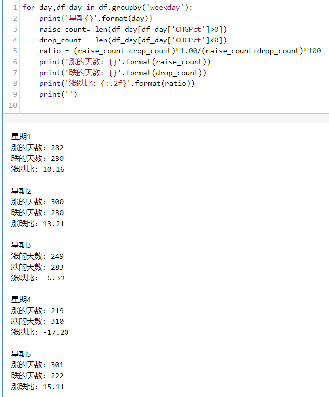 for day,df_day in df.groupby('weekday'): print('星期{}'.format(day)) raise_count= len(df_day[df_day['CHGPct']>0]) drop_count = len(df_day[df_day['CHGPct']<0]) ratio = (raise_count-drop_count)*1.00/(raise_count+drop_count)*100 print('涨的天数: {}'.format(raise_count)) print('跌的天数: {}'.format(drop_count)) print('涨跌比: {:.2f}'.format(ratio)) print('')