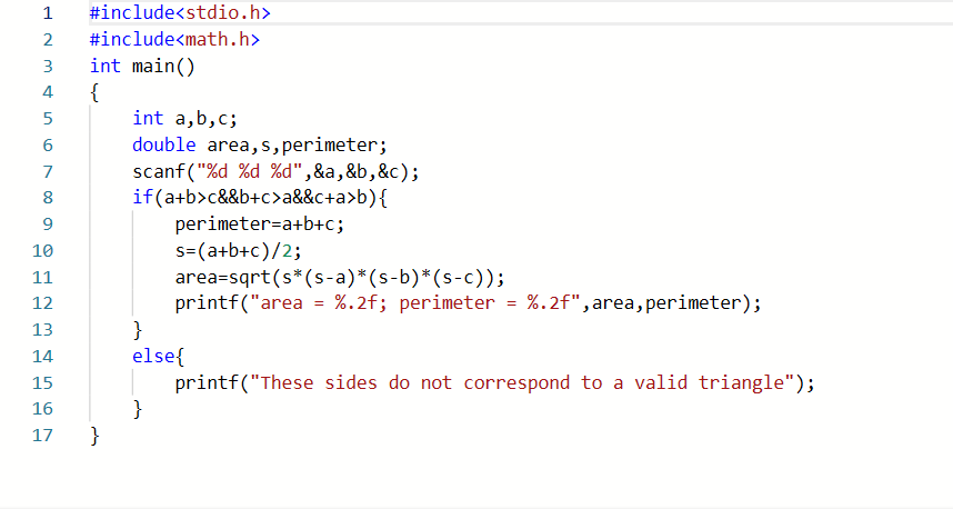 1.首先用int定义a,b,c,然后用double定义area,s,perimeter,用if-else语句和公式进行编写。