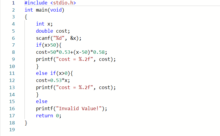 为了提倡居民节约用电,某省电力公司执行“阶梯电价”,安装一户一表的居民用户电价分为两个“阶梯”:月用电量50千瓦时(含50千瓦时)以内的,电价为0.53元/千瓦时;超过50千瓦时的,超出部分的用电量,电价上调0.05元/千瓦时。请编写程序计算电费。