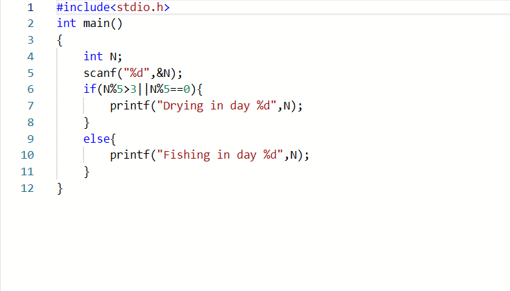 中国有句俗语叫“三天打鱼两天晒网”。假设某人从某天起,开始“三天打鱼两天晒网”,问这个人在以后的第N天中是“打鱼”还是“晒网”?