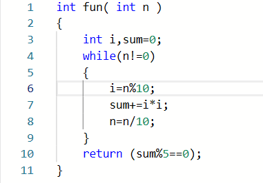 编写函数fun,其功能是:判断一个整数的各位数字平方之和能否被5整除,可以被5整除则返回1,否则返回0。