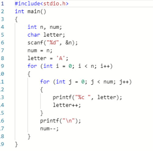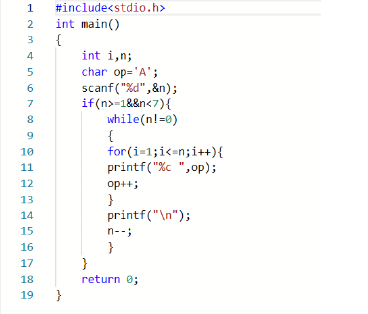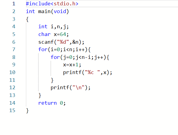 输出n行由大写字母A开始构成的三角形字符阵列。格式见输出样例,其中每个字母后面都有一个空格。