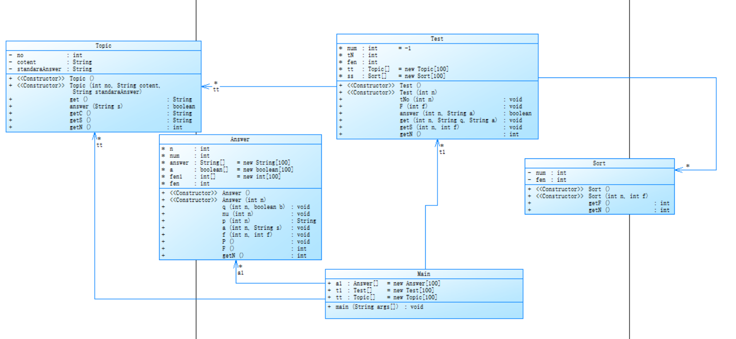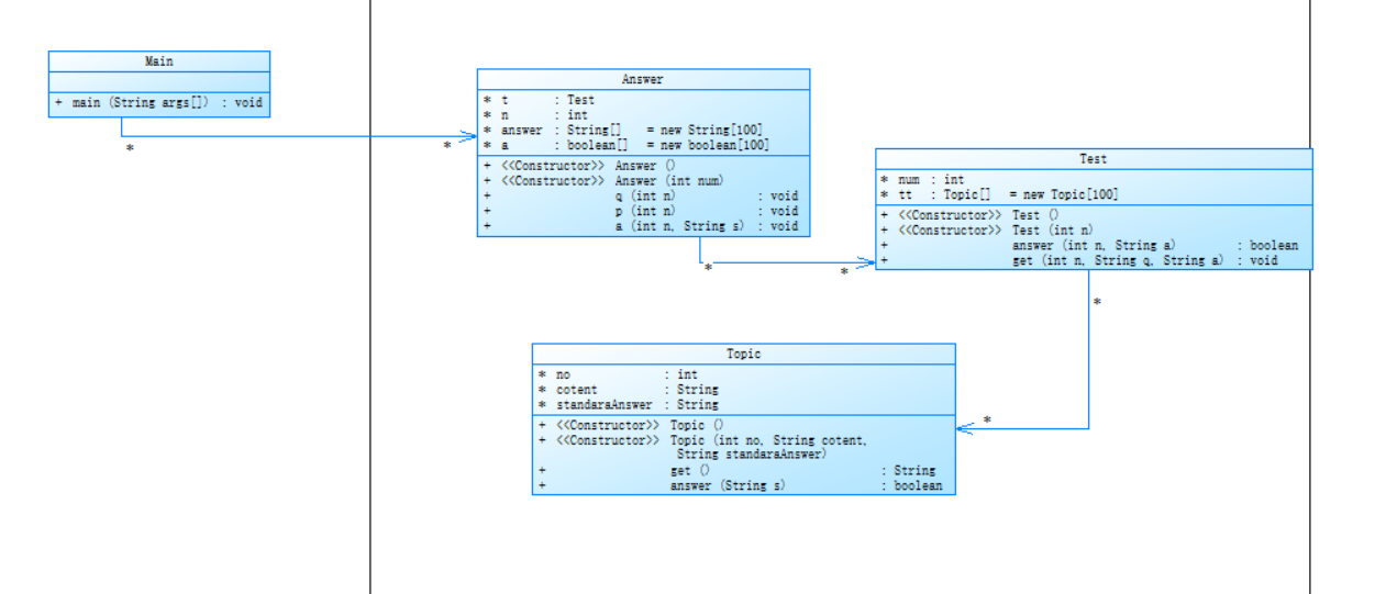 在这次题目中我设计了Topic,Answer,Test,Main四个类。就是按照老师给的建议类设计而设计的。第一次的程序根据老师给的建议设计很快就写出代码了,还是很简单的。