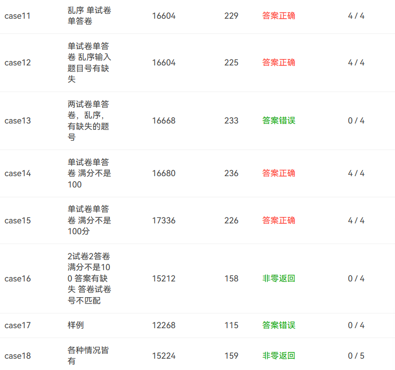 - 答卷中答案数量、顺序应与试卷的题目数量、顺序都一致,没注意这一点也导致了出现答案顺序对不上、答案数据不够时出现非零返回。