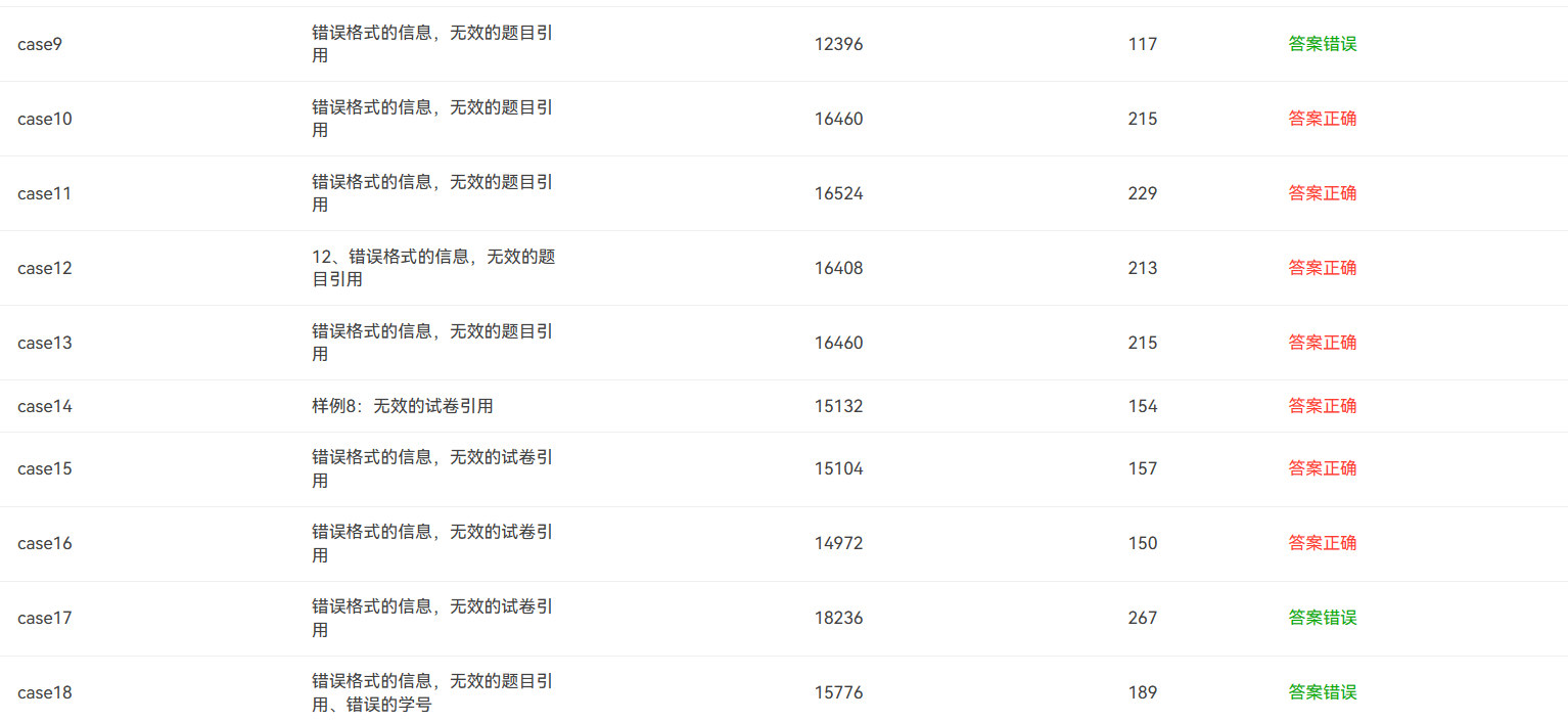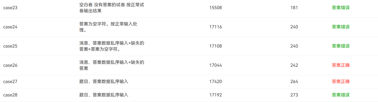 首先是空白卷和答案为空的区别:空白卷是答题时只输入了试卷信息和答题人的信息,没有输题号也没有输答案,这时会输入“answer is null”,而答案为空则是当答题时输入题号却没有输入答案会认为时正常的答卷,此时输出“题目+++false”。这两者非常不一样,卡在这里卡了很久。 - 乱序输入的问题:这次的答卷中答题的顺序可以打乱,但判题仍是按照试卷中的题目顺序,这个在最后判题并输出时需要注意顺序问题。