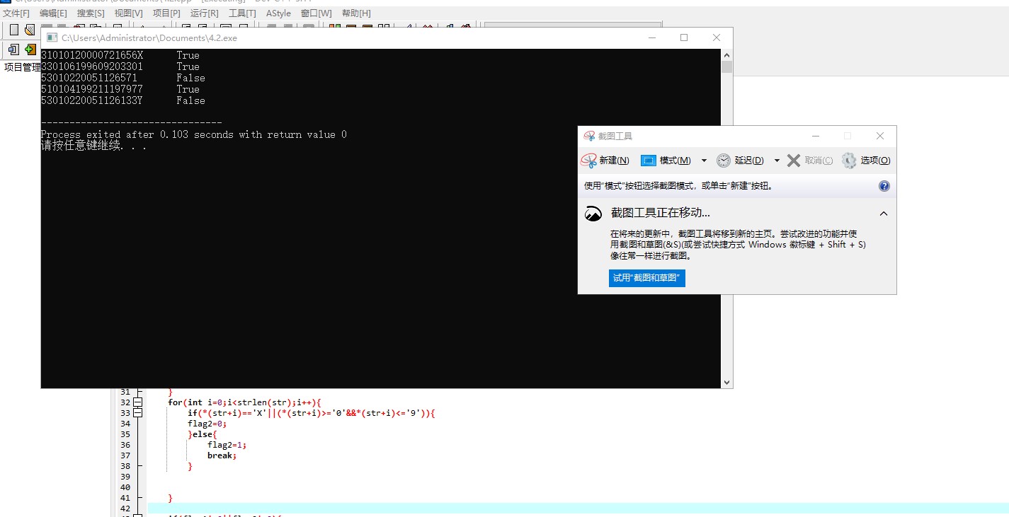 #include <string.h> #define N 5 int check_id(char *str); // 函数声明 int main() { char *pid[N] = {"31010120000721656X", "330106199609203301", "53010220051126571", "510104199211197977", "53010220051126133Y"}; int i; for (i = 0; i < N; ++i) if (check_id(pid[i])) // 函数调用 printf("%s\tTrue\n", pid[i]); else printf("%s\tFalse\n", pid[i]); return 0; } // 函数定义 // 功能: 检查指针str指向的身份证号码串形式上是否合法。 // 形式合法,返回1,否则,返回0 int check_id(char *str) { int flag1=0,flag2=0; if(strlen(str)!=18){ flag1=1; } for(int i=0;i<strlen(str);i++){ if(*(str+i)=='X'||(*(str+i)>='0'&&*(str+i)<='9')){ flag2=0; }else{ flag2=1; break; } } printf("%d %d\n",flag1,flag2); if(flag1!=0||flag2!=0){ return 0; } else{ return 1; } }