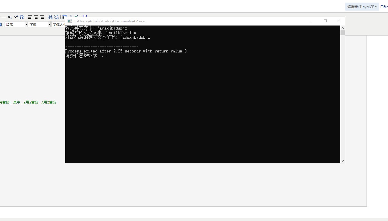 #include <stdio.h> #include <stdio.h> #define N 80 void encoder(char *str); // 函数声明 void decoder(char *str); // 函数声明 int main() { char words[N]; printf("输入英文文本: "); gets(words); printf("编码后的英文文本: "); encoder(words); // 函数调用 printf("%s\n", words); printf("对编码后的英文文本解码: "); decoder(words); // 函数调用 printf("%s\n", words); return 0; } /*函数定义 功能:对s指向的字符串进行编码处理 编码规则: 对于a~z或A~Z之间的字母字符,用其后的字符替换; 其中,z用a替换,Z用A替换 其它非字母字符,保持不变 */ void encoder(char *str) { while(*str){ if(*str=='Z'){ *str='A'; }else if(*str=='z'){ *str='a'; }else{ *str=*str+1; } str++; } } /*函数定义 功能:对s指向的字符串进行解码处理 解码规则: 对于a~z或A~Z之间的字母字符,用其前面的字符替换; 其中,a用z替换,A用Z替换 其它非字母字符,保持不变 */ void decoder(char *str) { while(*str){ if(*str=='A'){ *str='Z'; }else if(*str=='a'){ *str='z'; }else{ *str=*str-1; } str++; } }