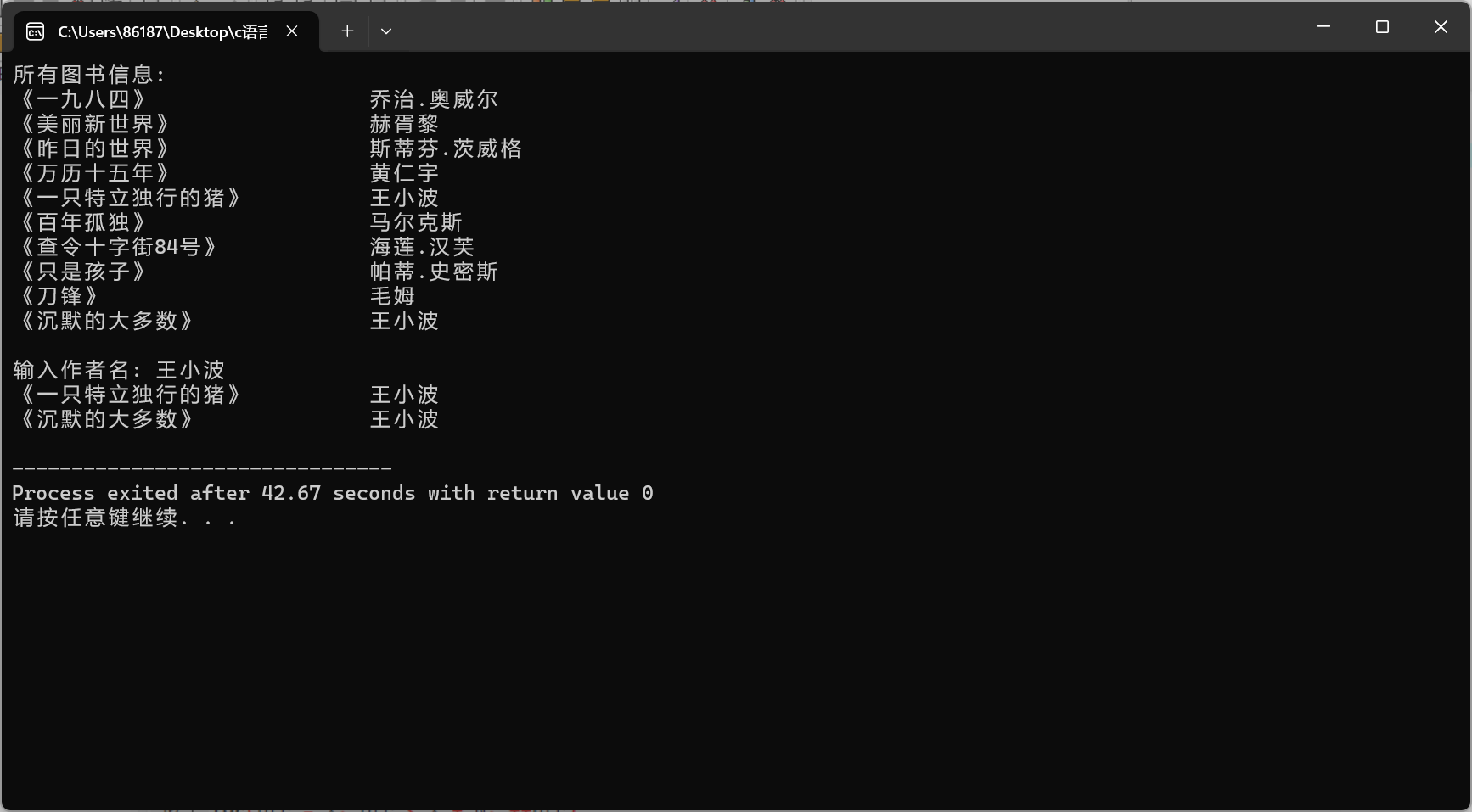 #include <stdio.h> #include <string.h> #define N 10 #define M 80 typedef struct { char name[M]; // 书名 char author[M]; // 作者 } Book; int main() { Book x[N] = { {"《一九八四》", "乔治.奥威尔"}, {"《美丽新世界》", "赫胥黎"}, {"《昨日的世界》", "斯蒂芬.茨威格"}, {"《万历十五年》", "黄仁宇"}, {"《一只特立独行的猪》", "王小波"}, {"《百年孤独》", "马尔克斯"}, {"《查令十字街84号》", "海莲.汉芙"}, {"《只是孩子》", "帕蒂.史密斯"}, {"《刀锋》", "毛姆"}, {"《沉默的大多数》", "王小波"} }; Book *ptr; int i; char author[M]; // 使用指针遍历结构体数组 printf("所有图书信息: \n"); for(ptr = x; ptr < x + N; ++ptr) printf("%-30s%-30s\n", ptr->name, ptr->author); // 查找指定作者的图书 printf("\n输入作者名: "); gets(author); for(ptr = x; ptr < x + N; ++ptr) if(strcmp(ptr->author, author) == 0) { printf("%-30s%-30s\n", ptr->name, ptr->author); } return 0; }