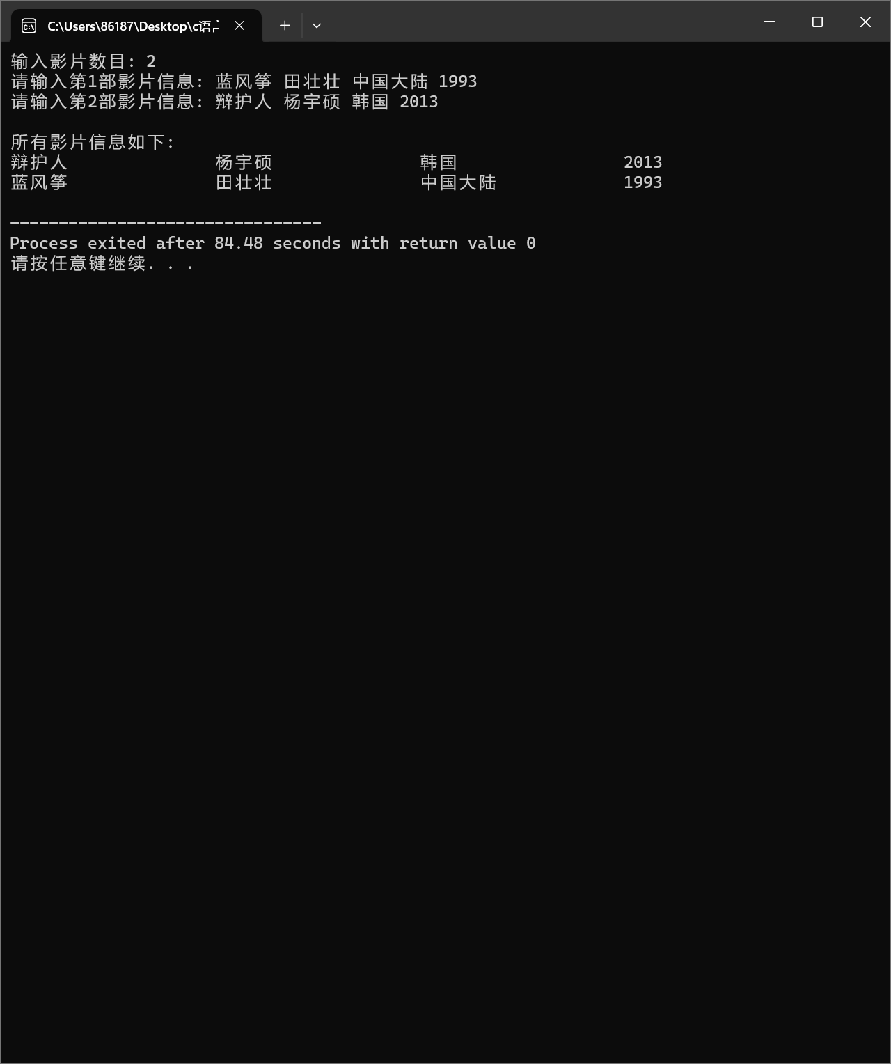 #include <stdio.h> #include <stdlib.h> #define N 80 typedef struct FilmInfo { char name[N]; char director[N]; char region[N]; int year; struct FilmInfo *next; } Film; void output(Film *head); // 遍历输出链表信息 Film *insert(Film *head, int n); // 向链表中插入n个结点,返回头指针 int main() { int n; // 结点数 Film *head; // 头指针变量,存放链表中第一个节点的地址 head = NULL; printf("输入影片数目: "); scanf("%d", &n); // 向链表中插入n部影片信息 head = insert(head, n); printf("\n所有影片信息如下: \n"); output(head); return 0; } // 向链表中插入n个结点,从表头插入,返回头指针变量 Film *insert(Film *head, int n) { int i; Film *p; for(i = 1; i <= n; ++i) { p = (Film *)malloc(sizeof(Film)); printf("请输入第%d部影片信息: ", i); scanf("%s %s %s %d", p->name, p->director, p->region, &p->year); // 把结点从表头插入到链表中 p->next = head; head = p; // 更新头指针变量 } return head; } // 遍历输出链表信息 void output(Film *head) { Film *p; p = head; while(p != NULL) { printf("%-20s %-20s %-20s %d\n", p->name, p->director, p->region, p->year); p = p -> next; } }