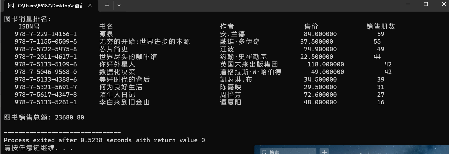 #include <stdio.h> #define N 10 typedef struct { char isbn[20]; // isbn号 char name[80]; // 书名 char author[80]; // 作者 double sales_price; // 售价 int sales_count; // 销售册数 } Book; void output(Book x[], int n); void sort(Book x[], int n); double sales_amount(Book x[], int n); int main() { Book x[N] = {{"978-7-229-14156-1", "源泉", "安.兰德", 84, 59}, {"978-7-5133-5261-1", "李白来到旧金山", "谭夏阳", 48, 16}, {"978-7-5617-4347-8", "陌生人日记", "周怡芳", 72.6, 27}, {"978-7-5722-5475-8", "芯片简史", "汪波", 74.9, 49}, {"978-7-5046-9568-0", "数据化决策", "道格拉斯·W·哈伯德", 49, 42}, {"978-7-5133-4388-6", "美好时代的背后", "凯瑟琳.布", 34.5, 39}, {"978-7-1155-0509-5", "无穷的开始:世界进步的本源", "戴维·多伊奇", 37.5, 55}, {"978-7-5321-5691-7", "何为良好生活", "陈嘉映", 29.5 , 31}, {"978-7-5133-5109-6", "你好外星人", "英国未来出版集团", 118, 42}, {"978-7-2011-4617-1", "世界尽头的咖啡馆", "约翰·史崔勒基", 22.5, 44}}; printf("图书销量排名: \n"); sort(x, N); output(x, N); printf("\n图书销售总额: %.2f\n", sales_amount(x, N)); return 0; } void output(Book x[],int n){ printf(" ISBN号 书名 作者 售价 销售册数\n"); for(int i=0;i<n;i++){ printf("%20s %-30s %-15s %-5f %-4d\n",x[i].isbn,x[i].name,x[i].author,x[i].sales_price,x[i].sales_count); } } void sort (Book x[],int n){ int i,j; for(i=0;i<n-1;i++){ for(j=i+1;j<n;j++){ Book t; if(x[i].sales_count<x[j].sales_count){ t=x[i]; x[i]=x[j]; x[j]=t; } } } } double sales_amount(Book x[], int n){ double sum=0; for(int i=0;i<n;i++){ sum+=(x[i].sales_price)*x[i].sales_count; } return sum; }