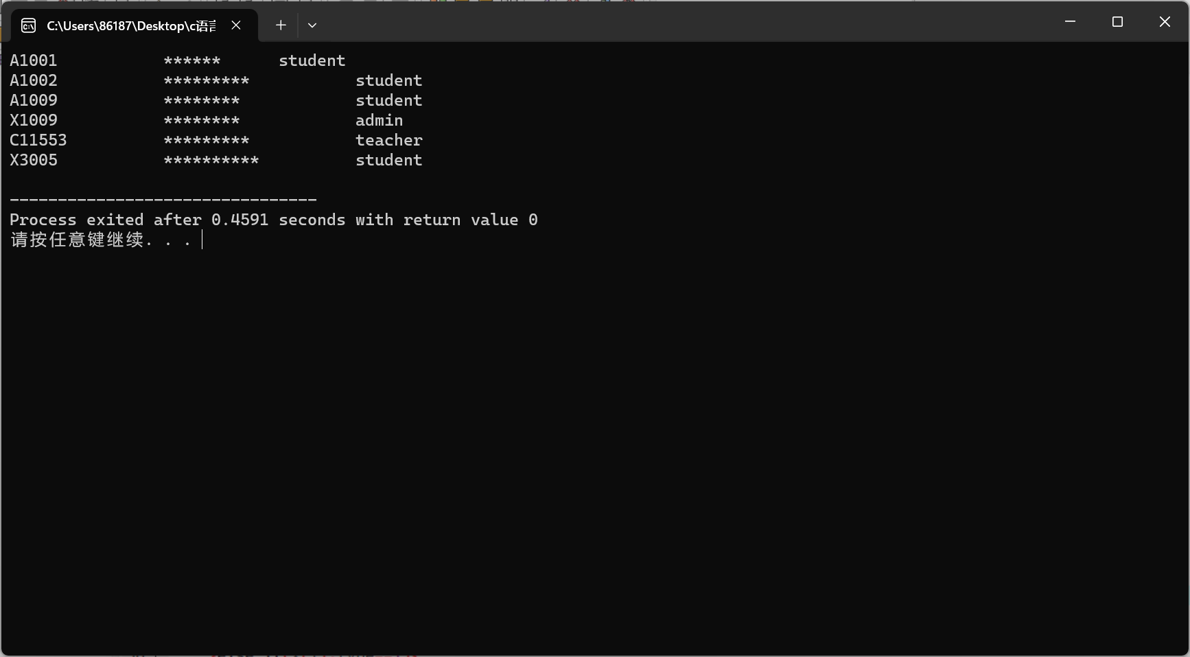 #include <stdio.h> #include <string.h> enum Role {admin, student, teacher}; typedef struct { char username[20]; // 用户名 char password[20]; // 密码 enum Role type; // 账户类型 } Account; // 函数声明 void output(Account x[], int n); int main() { Account x[] = {{"A1001", "123456", student}, {"A1002", "123abcdef", student}, {"A1009", "xyz12121", student}, {"X1009", "9213071x", admin}, {"C11553", "129dfg32k", teacher}, {"X3005", "921kfmg917", student}}; int n; n = sizeof(x)/sizeof(Account); output(x, n); return 0; } // 待补足的函数output()实现 // 功能:遍历输出账户数组x中n个账户信息 // 显示时,密码字段以与原密码相同字段长度的*替代显示 void output(Account x[], int n) { for(int i=0;i<n;i++){ int t=strlen(x[i].password); printf("%s\t\t",x[i].username); for(int j=0;j<t;j++){ printf("*"); } printf("\t"); if(x[i].type==0){ printf(" admin"); }else if(x[i].type==1){ printf(" student"); }else if(x[i].type==2){ printf(" teacher"); } printf("\n"); } }