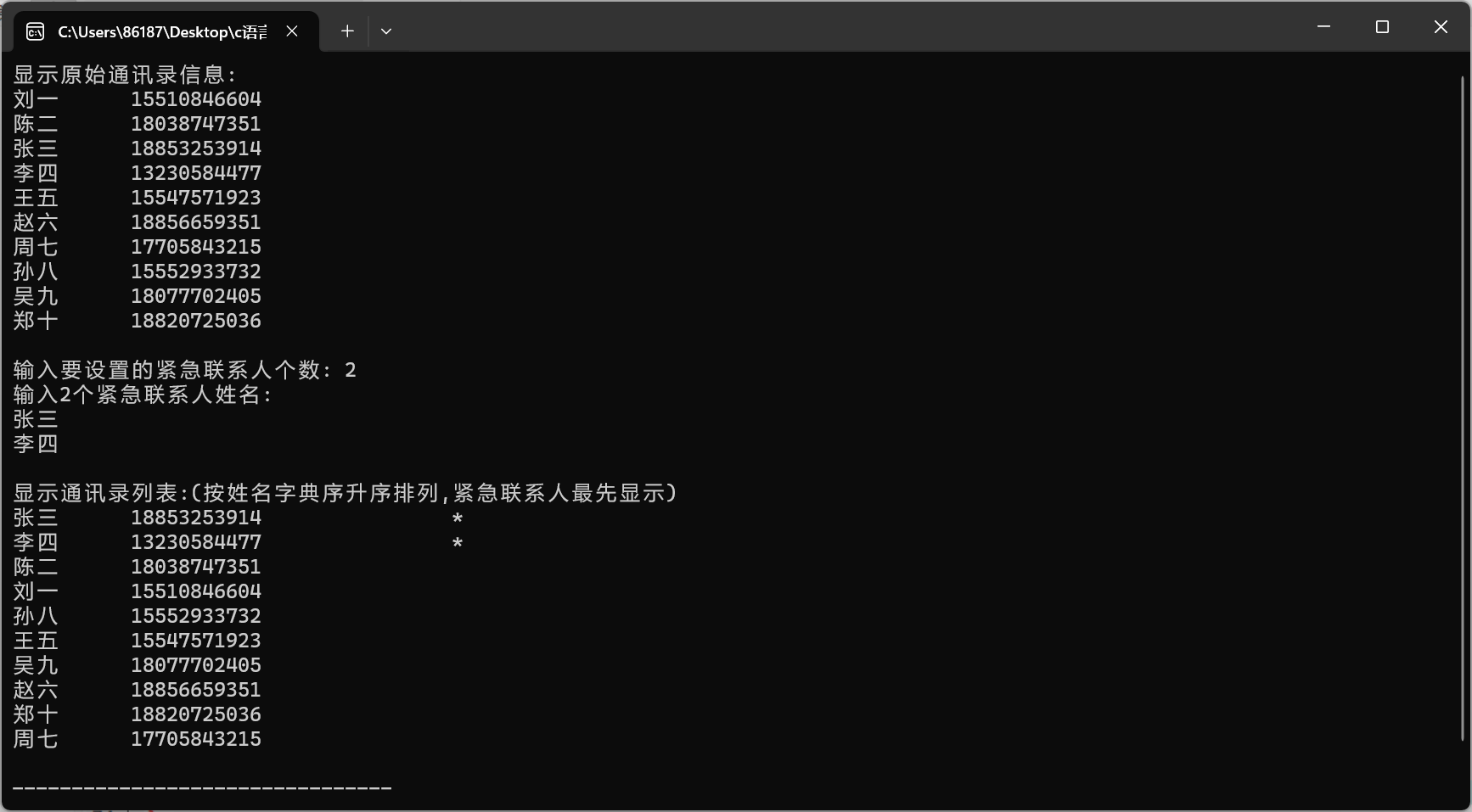 #include <stdio.h> #include <string.h> typedef struct { char name[20]; // 姓名 char phone[12]; // 手机号 int vip; // 是否为紧急联系人,是取1;否则取0 } Contact; // 函数声明 void set_vip_contact(Contact x[], int n, char name[]); // 设置紧急联系人 void output(Contact x[], int n); // 输出x中联系人信息 void display(Contact x[], int n); // 按联系人姓名字典序升序显示信息,紧急联系人最先显示 #define N 10 int main() { Contact list[N] = {{"刘一", "15510846604", 0}, {"陈二", "18038747351", 0}, {"张三", "18853253914", 0}, {"李四", "13230584477", 0}, {"王五", "15547571923", 0}, {"赵六", "18856659351", 0}, {"周七", "17705843215", 0}, {"孙八", "15552933732", 0}, {"吴九", "18077702405", 0}, {"郑十", "18820725036", 0}}; int vip_cnt, i; char name[20]; printf("显示原始通讯录信息: \n"); output(list, N); printf("\n输入要设置的紧急联系人个数: "); scanf("%d", &vip_cnt); printf("输入%d个紧急联系人姓名:\n", vip_cnt); for(i = 0; i < vip_cnt; ++i) { scanf("%s", name); set_vip_contact(list, N, name); } printf("\n显示通讯录列表:(按姓名字典序升序排列,紧急联系人最先显示)\n"); display(list, N); return 0; } // 补足函数set_vip_contact实现 // 功能:将联系人数组x中,联系人姓名与name一样的人,设置为紧急联系人(即成员vip值设为1) void set_vip_contact(Contact x[], int n, char name[]) { for(int i=0;i<n;i++){ if(strcmp(x[i].name,name)==0){ x[i].vip=1; } } } // 补足函数display实现 // 功能: 显示联系人数组x中的联系人信息 // 按姓名字典序升序显示, 紧急联系人显示在最前面 void display(Contact x[], int n) { for(int i=0;i<n;i++){ if(x[i].vip==1){ printf("%-10s%-15s *\n", x[i].name, x[i].phone); } } for(int i=0;i<n;i++){ if(x[i].vip==0){ for(int j=i+1;j<n;j++){ if(x[j].vip==0){ Contact t; if(strcmp(x[i].name,x[j].name)>0){ t=x[j]; x[j]=x[i]; x[i]=t; } } } printf("%-10s%-15s\n", x[i].name, x[i].phone);