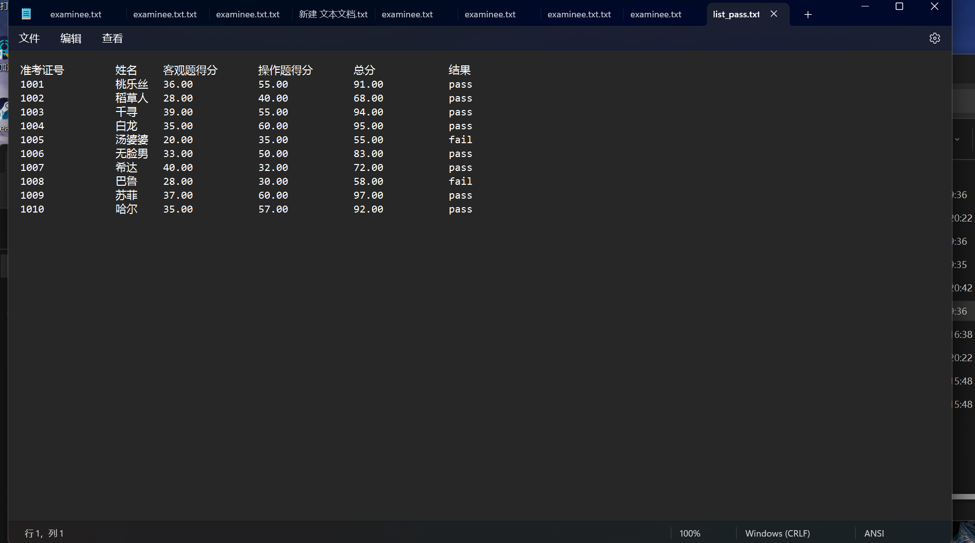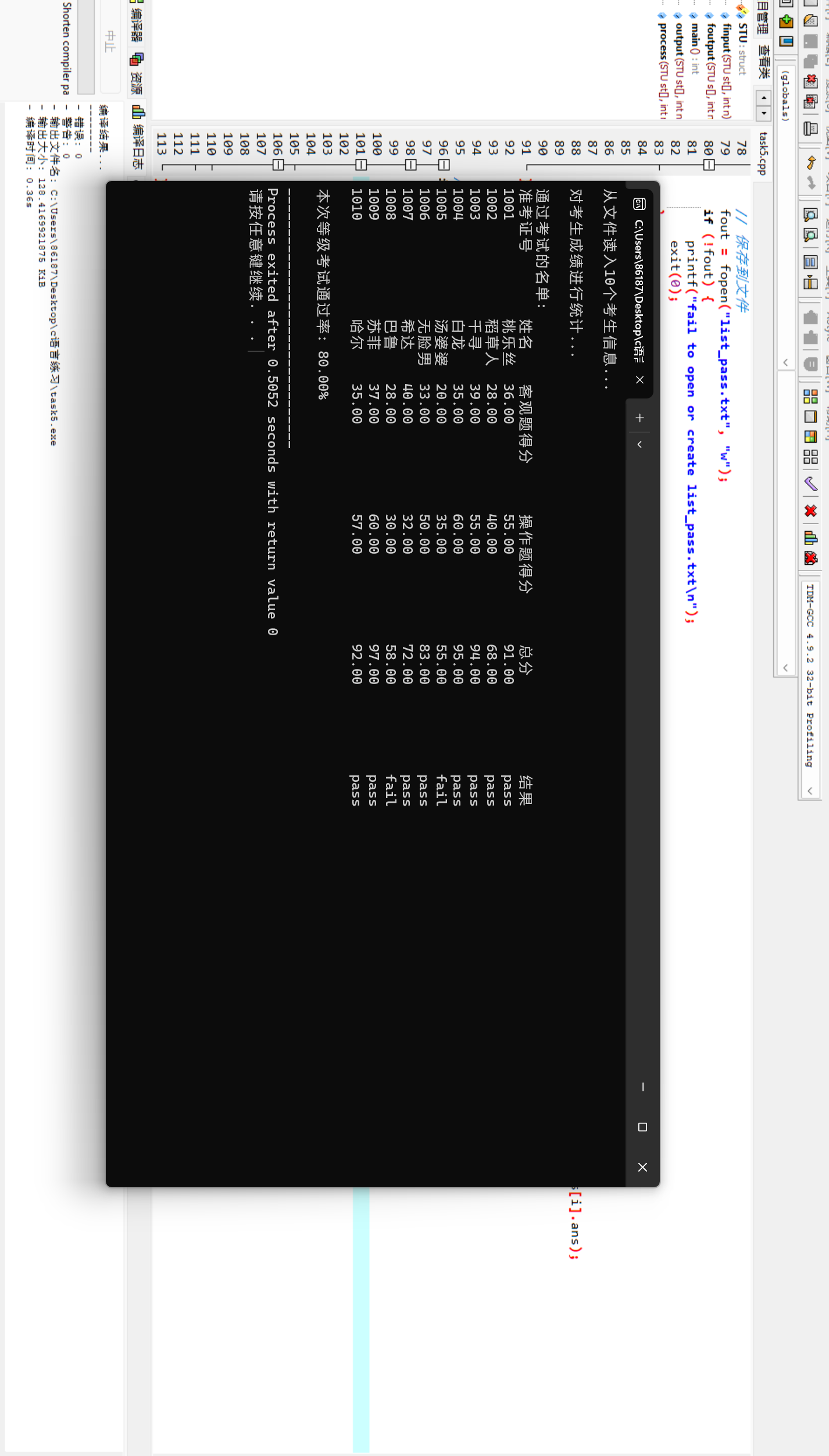 #include <stdio.h> #include <string.h> #include <stdlib.h> #define N 10 typedef struct { long int id; char name[20]; float objective; // 客观题得分 float subjective; // 操作题得分 float sum; // 总分 char ans[10]; // 考试结果 } STU; // 函数声明 void finput(STU st[], int n); void foutput(STU st[], int n); void output(STU st[], int n); int process(STU st[], int n, STU st_pass[]); int main() { STU stu[N], stu_pass[N]; int cnt; double pass_rate; printf("从文件读入%d个考生信息...\n", N); finput(stu, N); printf("\n对考生成绩进行统计...\n"); cnt = process(stu, N, stu_pass); printf("\n通过考试的名单:\n"); output(stu_pass, N); // 输出到屏幕 foutput(stu_pass, N); // 输出到文件 pass_rate = 1.0 * cnt / N; printf("\n本次等级考试通过率: %.2f%%\n", pass_rate*100); return 0; } // 把通过考试的考生完整信息输出到屏幕上 // 准考证号,姓名,客观题得分,操作题得分,总分,结果 void output(STU st[], int n) { int i; printf("准考证号\t姓名\t客观题得分\t操作题得分\t总分\t\t结果\n"); for (i = 0; i < n; i++) printf("%ld\t\t%s\t%.2f\t\t%.2f\t\t%.2f\t\t%s\n", st[i].id, st[i].name, st[i].objective, st[i].subjective, st[i].sum, st[i].ans); } // 从文本文件examinee.txt读入考生信息:准考证号,姓名,客观题得分,操作题得分 void finput(STU st[], int n) { int i; FILE *fin; fin = fopen("examinee.txt", "r"); if (fin == NULL) { printf("fail to open file\n"); exit(0); } while (!feof(fin)) { for (i = 0; i < n; i++) fscanf(fin, "%ld %s %f %f", &st[i].id, st[i].name, &st[i].objective, &st[i].subjective); } fclose(fin); } // 把通过考试的考生完整信息写入文件list_pass.txt // 准考证号,姓名,客观题得分,操作题得分,总分,结果 void foutput(STU s[], int n) { FILE *fout; int i; // 保存到文件 fout = fopen("list_pass.txt", "w"); if (!fout) { printf("fail to open or create list_pass.txt\n"); exit(0); } fprintf(fout, "准考证号\t\t姓名\t客观题得分\t操作题得分\t总分\t\t结果\n"); for (i = 0; i < n; i++) fprintf(fout, "%ld\t\t%s\t%.2f\t\t%.2f\t\t%.2f\t\t%s\n", s[i].id, s[i].name, s[i].objective, s[i].subjective, s[i].sum, s[i].ans); fclose(fout); } // 对考生信息进行处理:计算每位考生考试总分、结果;统计考试通过的人数 int process(STU st[], int n, STU st_pass[]) { int i=0,sum1=0,p=0,a=0; for(i=0;i<n;i++){ st[i].sum=st[i].objective+st[i].subjective; sum1=st[i].objective+st[i].subjective; if(sum1>=60){ st_pass[p]=st[i]; strcpy(st_pass[p].ans,"pass"); p++;a++; } else{ st_pass[p]=st[i]; strcpy(st_pass[p].ans,"fail"); p++; } } return a; }