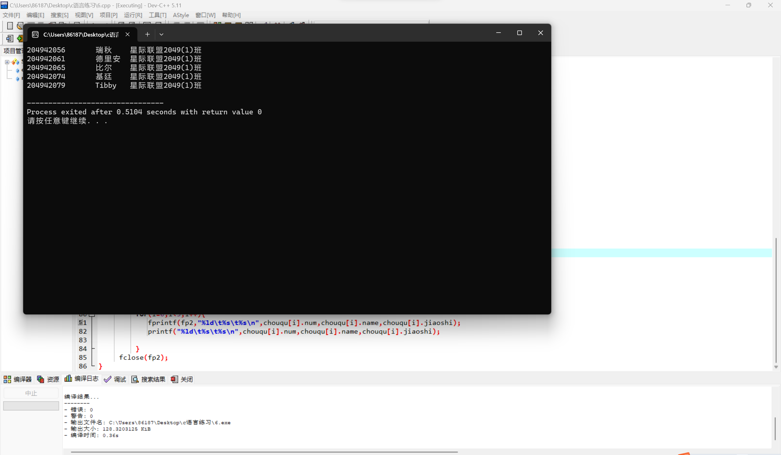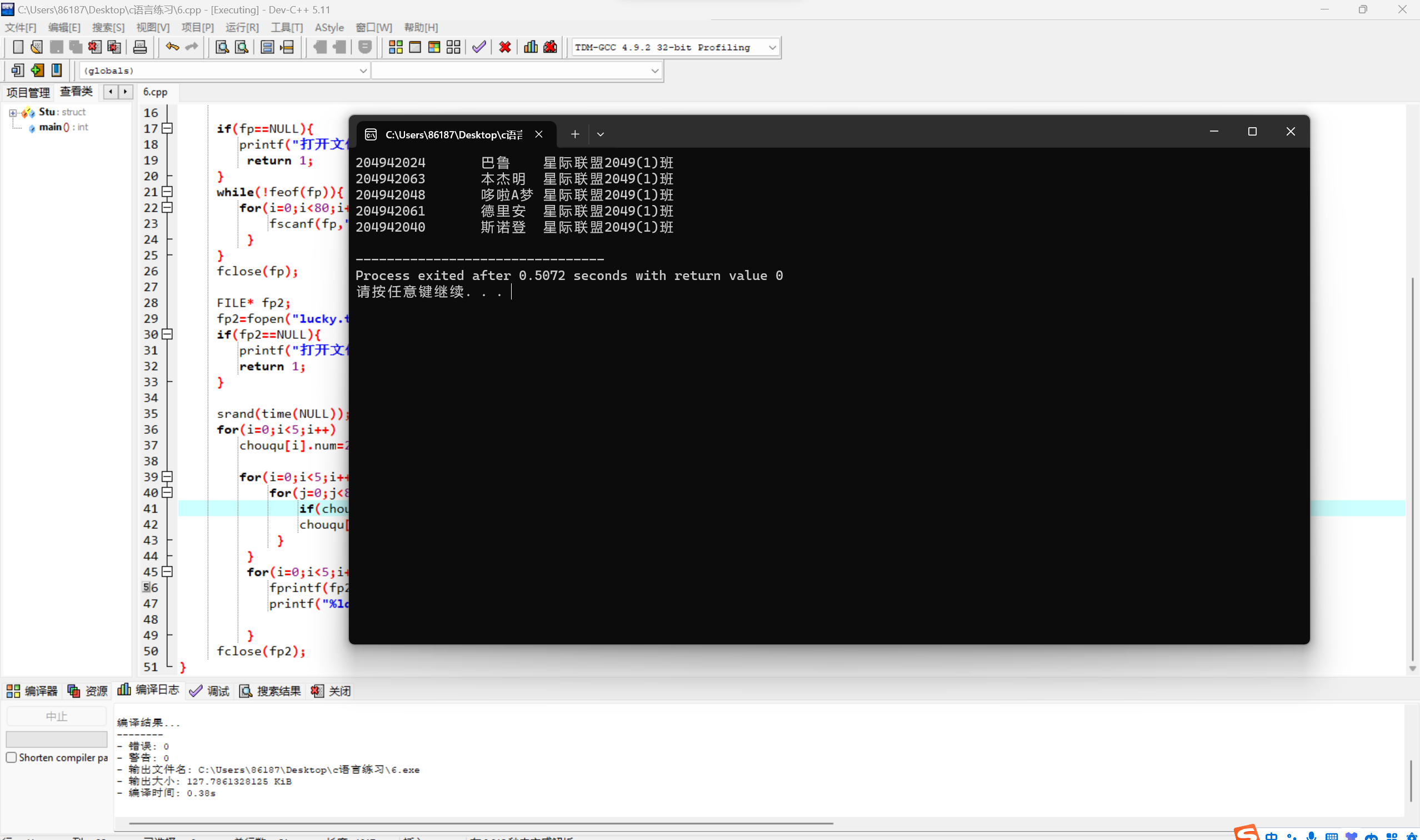 #include <stdio.h> #include <stdlib.h> #include <time.h> #include <string.h> typedef struct{ long int num; char name[20]; char jiaoshi[20]; }Stu; void chouqu1(Stu chouqu[]){ int i; for(i=0;i<5;i++) chouqu[i].num=204942000+rand()%80+1; } int main(){ int i,j; Stu x[80]; Stu chouqu[5]; FILE* fp; fp=fopen("list.txt","r"); if(fp==NULL){ printf("打开文件失败\n"); return 1; } while(!feof(fp)){ for(i=0;i<80;i++){ fscanf(fp,"%ld%s%s",&x[i].num,x[i].name,x[i].jiaoshi); } } fclose(fp); FILE* fp2; fp2=fopen("lucky.txt","w"); if(fp2==NULL){ printf("打开文件失败\n"); return 1; } srand(time(NULL)); for(i=0;i<5;i++) chouqu[i].num=204942000+rand()%80+1; int flag=1; while(flag==1) { for(i=0;i<5;i++){ int flag2=0; for(j=i+1;j<5;j++){ if(chouqu[i].num==chouqu[j].num){ flag=1; flag2=1; chouqu1(chouqu); break; } } if(flag2==0) flag=0; } } for(i=0;i<5;i++){ for(j=0;j<80;j++){ if(chouqu[i].num==x[j].num) chouqu[i]=x[j]; } } for(i=0;i<5;i++){ for(j=i+1;j<5;j++){ Stu temp; if(chouqu[i].num>chouqu[j].num){ temp=chouqu[i]; chouqu[i]=chouqu[j]; chouqu[j]=temp; } } } for(i=0;i<5;i++){ fprintf(fp2,"%ld\t%s\t%s\n",chouqu[i].num,chouqu[i].name,chouqu[i].jiaoshi); printf("%ld\t%s\t%s\n",chouqu[i].num,chouqu[i].name,chouqu[i].jiaoshi); } fclose(fp2); }