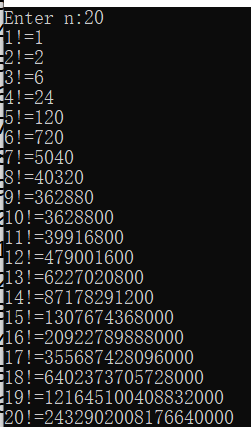printf("%d!=%lld\n",i,fac (i));
