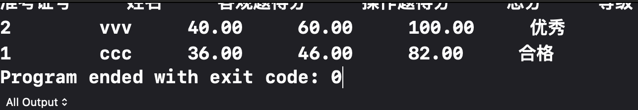 //输出考生完整信息: 准考证号,姓名,客观题得分,操作题得分,总分,等级