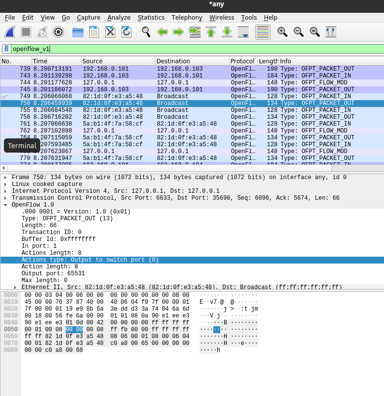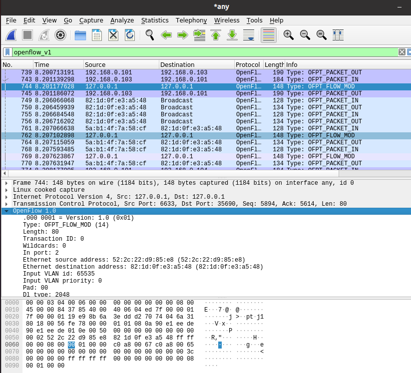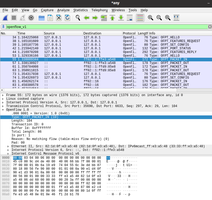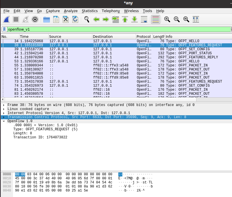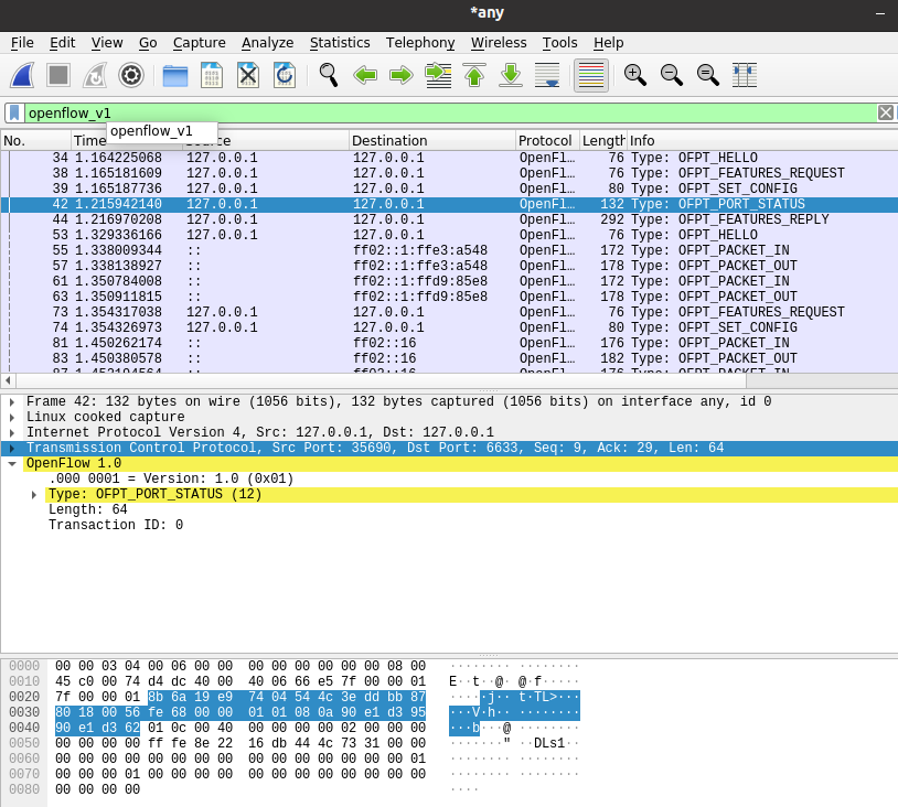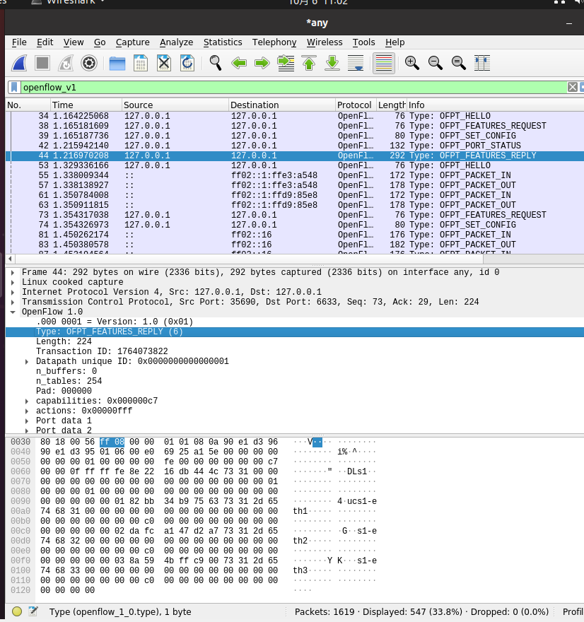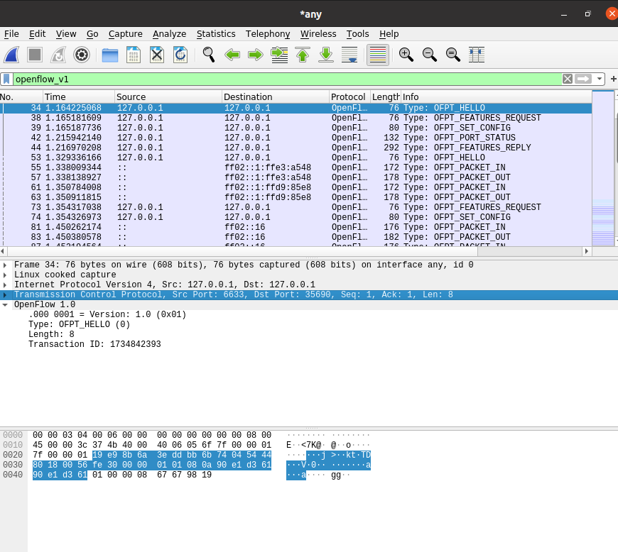 2.能够借助包解析工具,分析与解释 OpenFlow协议的数据包交互过程与机制。