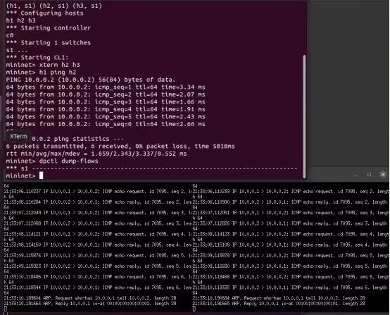 - 阅读Ryu文档的The First Application一节,运行当中的L2Switch,h1 ping h2或h3,在目标主机使用 tcpdump 验证L2Switch,分析L2Switch和POX的Hub模块有何不同。
